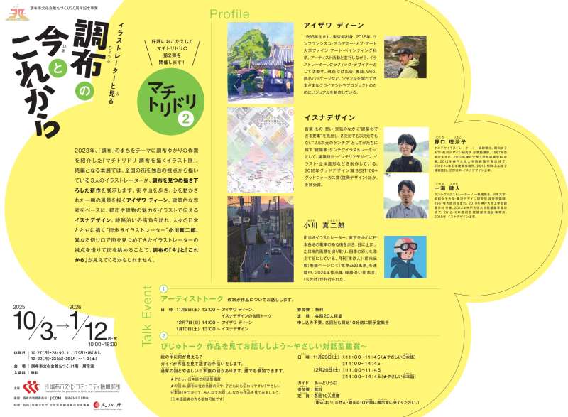 2023年、「調布」のまちをテーマに調布ゆかりの作家を紹介した「マチトリドリ 調布を描くイラスト展」。続編となる本展では、全国の街を独自の視点から描いている3組のイラストレーターが、調布を見つめ描き下ろした新作を展示します。
