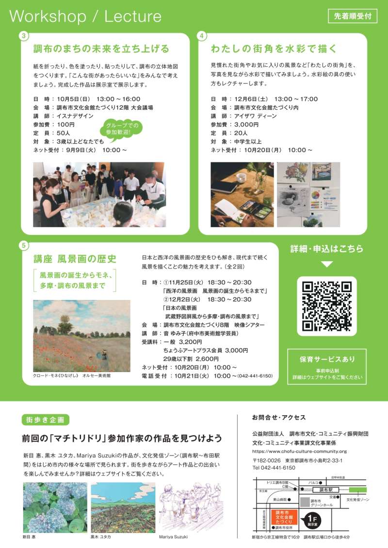プログラム | 関連イベントも多数開催! 詳細についてはこちら(外部リンク)をご覧ください。 ●開催期間 2025年10月3日(金)〜2026年1月12日(月・祝) 10:00~18:00 ※10月27日(月)・28日(火)、11月17日(月)・18日(火)、12月22日(月)・23日(火)・29日(月)~2026年1月3日(土)は休館日 ●展示作家 アイザワ ディーン、イスナデザイン、小川真二郎 展示作家の詳細ページ(外部リンク) ●ワークショップ ワークショップ「調布のまちの未来を立ち上げる」 紙を折ったり、色を塗ったり、貼ったりして、調布の立体地図をつくります。「こんな街があったらいいな」をみんなで考えましょう。完成した作品は展示室で展示します。 日時 10月5日(日)13:00~16:00 講師 イスナデザイン 会場 調布市文化会館たづくり12階 大会議場 定員 各回50人 参加費 ひとり100円 対象 3歳以上どなたでも ご家族などグループでの参加も歓迎です! 申込み 9月9日(火)10:00 ~ インターネット先着順申込 ※保育サービス有・要事前申込 ワークショップの詳細や申込方法については、公式サイト(外部リンク)をご覧ください。 ワークショップ 「わたしの街角を水彩で描く」 見慣れた街角やお気に入りの風景など「わたしの街角」を、写真を見ながら水彩で描いてみましょう。水彩絵の具の使い方もレクチャーします。 日時 12月6日(土)13:00~17:00 講師 アイザワ ディーン 会場 調布市文化会館たづくり3階 301・302会議室 定員 20人 参加費 3000円 対象 中学生以上 申込み 10月20日(月)10:00~ インターネット先着順申込 ※保育サービス有・要事前申込 関連講座 「風景画の歴史 風景画の誕生からモネ、多摩・調布の風景まで」 日本でも西洋でも描かれた風景画。しかし、その成り立ちや展開の仕方は大きく異なります。中国からもたらされた山水画の豊かな伝統に恵まれた日本、一方、西洋で風景画が盛んに描かれるのは、19世紀になってからです。この講座では、日本と西洋の風景表現を比較しながら、それぞれの魅力を紹介します。 日時・カリキュラム(全2回) ①11月25日(火)18:30~20:30「西洋の風景画 風景画の誕生からモネまで」 ②12月2日(火)18:30~20:30「日本の風景画 武蔵野図屏風から多摩・調布の風景まで」 講師 音 ゆみ子(府中市美術館学芸員) 会場 調布市文化会館たづくり8階 映像シアター 定員 100人 受講料(全2回分) 一般 3200円、ちょうふアートプラス会員 3000円、29歳以下割 2600円 申込み ネット受付:10月20日(月)10:00~/電話受付:10月21日(火)10:00~(042-441-6150) ※保育サービス有・要事前申込 アーティストトーク 作家が作品についてお話しします。 日時 11月8日(土)13:00 ~ アイザワ ディーン、イスナデザインの合同トーク 12月7日(日)14:00 ~ アイザワ ディーン 1月10日(土)13:00 ~ イスナデザイン 参加費 無料 定員 各回20人程度 申込不要。各回とも開始10分前に展示室集合 びじゅトーク 作品を見てお話ししよう~やさしい対話型鑑賞(たいわがたかんしょう)~ 絵の中に何が見える?ガイドが作品を見て話すお手伝いをします。 通常の回とやさしい日本語の回があります。誰でも参加できます。 日時 11月29日(土) ①11:00~11:45(★やさしい日本語)②14:00~14:45 12月20日(土) ①11:00~11:45 ②14:00~14:45(★やさしい日本語) ★はやさしい日本語(にほんご)で対話型鑑賞(たいわがたかんしょう)の回です。調布に住む外国の人や、こどもにも伝わりやすい「やさしい日本語」をつかって、みんなでお話ししながら作品をみてみましょう。(日本語話者の方も参加可能です) ガイド あーとりうむ 参加費 無料 定員 各回10人程度 申込はいりません。はじまる10分前に展示室(てんじしつ)に来てください 街歩き企画 前回の「マチトリドリ」参加作家の作品を見つけよう 新目 惠、黒木 ユタカ、Mariya Suzukiの作品が、文化発信ゾーン(調布駅~布田駅間)をはじめ市内の様々な場所で見られます。街を歩きながらアート作品との出会いを楽しんでみませんか? 作品が見られる場所は会期中に随時追加予定です! 街歩きマップはこちらのページ(外部リンク)からご覧ください。 コサイト編集部員が、前回の「マチトリドリ」にお邪魔したときの様子はこちら! コサイトのイラストも!「子どもたちに見てほしい」黒木ユタカさん 調布にゆかりある3人のアーティストによるクロストーク開催! 調布市民は入会金・年会費無料!アートに触れられる機会を増やす、お得な会員サービス「ちょうふアートプラス」については、こちらのページをご覧ください。 |