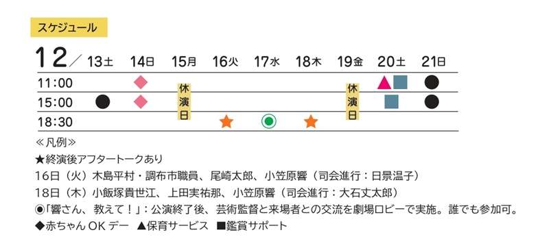 プログラム | ●公演日程 12月13日(土)15:00 12月14日(日)11:00/15:00 12月16日(火)18:30 12月17日(水)18:30 12月18日(木)18:30 12月20日(土)11:00/15:00 12月21日(日)11:00/15:00 ※受付は開演の45分前(開場は開演の30分前) ※上演時間 約70分(予定) ※公演内容はすべて同じです 公演の詳しい内容についてはこちら(外部リンク)をご覧ください。 ●あらすじ 調布市仙川から長野県木島平村(※)に引っ越してきた少年真一。 美しい自然に囲まれた木島平には古くから伝わる火祭り、柱松子(はしらまつこ)という神事がある。 転校早々、祭りの主役、天狗(てんぐ)に選ばれてしまった真一は、同級生の灯(あかり)や翔(しょう)、ビックと一緒に稽古を始める。クラスメイトとも馴染めず稽古にもついていけない真一は父ともぶつかり、高井富士と呼ばれる山に一人で足を踏み入れてしまう。そこで真一が出会ったのは…。 ※長野県木島平村とは・・ 今年で調布市の姉妹都市盟約40周年を迎える長野県の北側に位置する村。スキーリゾートや温泉地に囲まれ、季節を問わず多くの人が訪れる。 https://kijimadaira.org/ ●関連イベント 稽古場見学ツアー(事前予約) 「木島平のカロ」の稽古場が見学できます。 日時 11月29日(土)15:30~16:30 料金 無料 定員 15名程度(最大22人)※先着順 対象 中学生以上の方(どなたでもご参加いただけます) ※ただし、外国語の通訳ができるスタッフはおりません ※お手伝いが必要な方はあらかじめお知らせください ナビゲーター 櫻井拓見 申込み メールフォーム(外部リンク)からお申込みください。 終演後アフタートーク 終演後、舞台上でアフタートークを実施します。当日の公演のチケットをお持ちでない方もご入場いただけます。 必ずチケットまたは半券をお持ちください。(所要時間30分程度) 16日(火)木島平村・調布市職員×尾崎太郎×小笠原響芸術監督(司会進行:日景温子) 18日(木)小飯塚貴世江×上田実祐那×小笠原響芸術監督(司会進行:大石丈太郎) 「響さん、教えて!」(芸術監督Q&A) 芸術監督と市民の皆さんとの交流会を行います。どなたでもご参加いただけます。(所要時間20分程度) 日時 12月17日(水)18:30の回終演後 場所 せんがわ劇場ロビー 司会進行 櫻井拓見 ●鑑賞サポート 本公演では、多くのお客様に舞台芸術を楽しんでもらうための鑑賞サポートを実施します。 こちらでお席をご用意しますので、チケットの購入前にお申込みください。 先着順・お席には限りがございます。 ※申し込み開始:10月29日(水)から A 字幕タブレット(申込必須・無料) 20日(土)午前11時の回、午後3時の回 セリフや効果音などの情報を字幕タブレット機でご覧いただけます。(機材は無料レンタル) 聴覚障害者優先になります。ご利用になる方は、開演の15分前までに受付にお越しください。 B 音声ガイド(申込必須・無料) 20日(土)午前11時の回、午後3時の回 開演前の作品や登場人物などの解説に加え、上演中の舞台転換や役者のしぐさをライブ音声で解説します(機材は無料レンタル)。 視覚障害者優先になります。ご利用になる方は、開演前の解説があるため開場時間(開演30分前)までに受付にお越しください。 C 誘導サポート(申込必須・無料) 仙川駅(京王線)から劇場までスタッフがご案内します。 ※視覚障害者のみ。音声ガイドと一緒にお申し込みください。 D 保育サービス(申込必須・有料) 20日(土)午前11時の回 劇場内に保育スペースを設け、上演中に専門の保育士がお子さんをお預かりします。 対象 生後6か月以上の未就学児(定員あり) 料金 1人1回1000円 鑑賞サポートの申込方法や申込締切等、詳細はこちら(外部リンク)をご覧ください。 ●赤ちゃんOKデー(14日11:00/15:00の回) 14日(日)11:00/15:00は、3歳未満のお子さんも入場できます。上演中の出入り可能です(席は有料・ひざ上無料)。 ※授乳スペース、ベビーカー置き場があります ※落ち着いて鑑賞したい方は別日のご観劇をおすすめします ※ひざ上無料について:0~2歳が対象。赤ちゃんOKデーのみ ●料金 ※未就学児は要保護者同伴、3年生以下は保護者同伴推奨 ★おやこペア券がオススメです★ ちょうふアートプラス会員 3600円 一般 4000円 会員おやこペア(会員+こども)4200円 おやこペア(一般+こども)4600円 クッション席(親子ペア)4000円 こども(小学生以下)1000円 U29 2500円 ※税込・全席指定 ※3歳以上入場可(3歳未満は14日の赤ちゃんOKデーのみ入場可) ※クッション席(親子ペア)は大人1名、お子様1名でお座りいただける席です ●チケット発売日 ちょうふアートプラス会員 11月5日(水) 一般 11月7日(金) ※発売初日9:00~はインターネット販売のみ。翌日9:00~電話予約受付、10:00~窓口販売となります。 チケットの購入方法についてはこちら(外部リンク)をご覧ください。 ●関連企画*木島平村アンテナショップ「新鮮屋」出張販売 日時 12月14日(日)、20日(土)、21日(日)12:00~13:00 内容 りんご、おやき、十割そばなど、木島平村の特産品を販売します 場所 せんがわ劇場正面入り口 調布市民は入会金・年会費不要! アートをもっと身近にする「