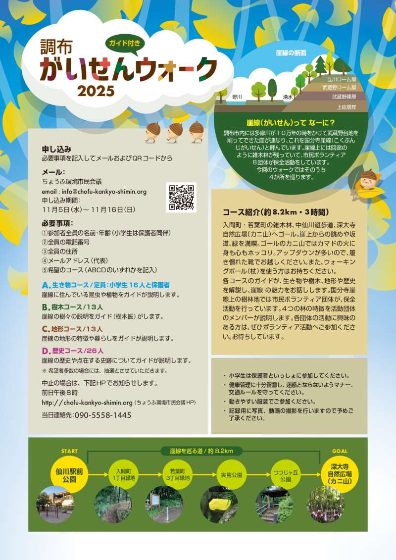 | プログラム | 参加費 大人300円 小学生100円 申し込み 必要事項を記入してメールおよび専用フォーム(11/5より)から ちょうふ環境市民会議 メール:info@chofu-kankyo-shimin.org 申し込み期間 11/5(水)〜11/16(日) 必要事項 参加者全員の名前・年齢(小学生は保護者同伴) 全員の電話番号 全員の住所 メールアドレス(代表) 希望のコース(ABCDのいずれかを記入) A.生き物コース/定員:小学生16人と保護者 崖線に住んでいる昆虫や植物をガイドが説明します。 B.木コース/13人 崖線の街々の説明をガイド(木医)がします。 C.地形コース/13人 崖線の地形の特徴や暮らしをガイドが説明します。 D.歴史コース/26人 崖線の歴史や点在する史跡についてガイドが説明します。 ※希望者多数の場合には、抽選とさせていただきます。 <ご注意> ・小学生は保護者といっしょに参加してください。 ・健康管理に十分留意し、迷惑とならないようマナー、交通ルールを守ってください。 ・動きやすい服装でご参加ください。 ・記録用に写真、動画の撮影を行いますので予めご了承ください。 当日集合場所 仙川駅前公園(クィーンズ伊勢丹向かい) 当日集合時間 A生き物コース 午前8時30分 B樹木 C地形 D歴史コース 午前9時 中止の場合はちょうふ環境市民会議HPでお知らせ(前日午後8時)します。 当日連絡先:090-5558-1445 |