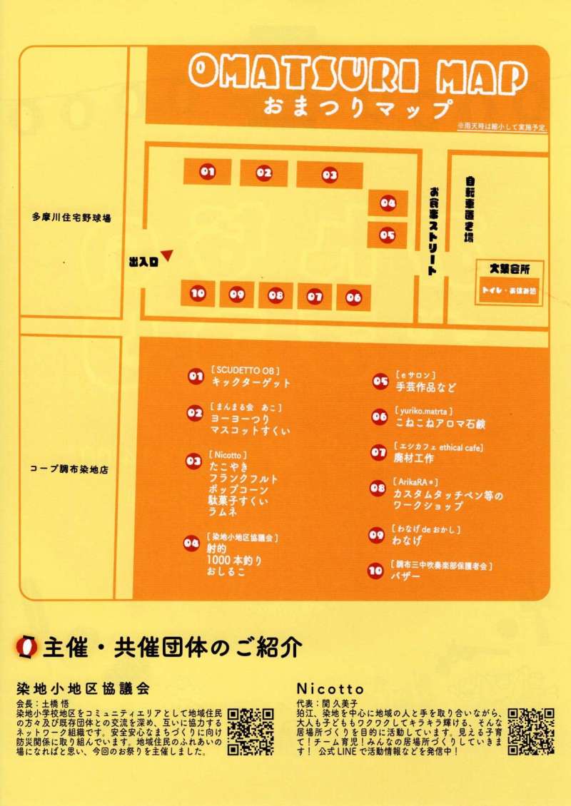 | プログラム | ミニゲーム キックターゲット。ヨーヨーつり、マスコットすくい、射的、1000本釣り、わなげ 飲食 たこやき、フランクフルト、ポップコーン、駄菓子すくい、おしるこ、ラムネ ワークショップ・バザーなど 手芸作品の販売、アロマ石鹸、廃材工作、カスタムタッチペン等のワークショップ、バザー ※雨天決行(雨天時会場:多摩川住宅ロ号棟集会所) |