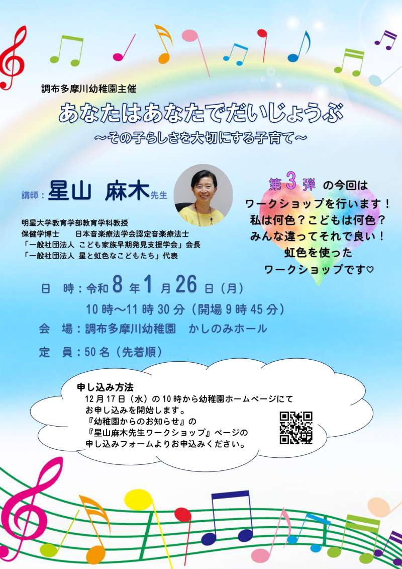 2023年、2024年の開催時も大好評だった、星山麻木先生による講演会。第3弾となる今回はワークショップ形式で、自分の“色”や子どもの“色”について学び、考えます。