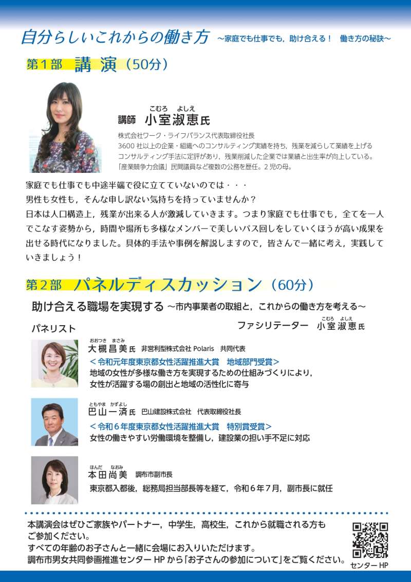 | プログラム | ●開催日時 2026年3月14日(土) 13:30~15:50 ※13:00開場 ●イベント概要 第1部 講演(50分) 講師 小室淑恵(株式会社ワーク・ライフバランス代表取締役社長) 第2部 パネルディスカッション(60分) 助け合える職場を実現する ~市内事業者の取組と、これからの働き方を考える~ ファシリテーター:小室淑恵 パネリスト:大槻昌美(非営利型株式会社 Polaris 共同代表)、巴山一済(巴山建設株式会社 代表取締役社長)、本田尚美(調布市副市長) 詳細については、こちらのページ(外部リンク)をご覧ください。 ●参加費 無料 ●定員 400名 ●申込方法 申込フォーム(外部リンク)からお申し込みください。 ●一時保育について(要事前予約) 対象 1歳以上就学前のお子さん 定員 若干名 ※保育室は文化会館たづくり7階になります。詳細は保育決定後にご連絡します。 申込受付期間 2月6日(金)〜2月26日(木) ご希望の方は調布市男女共同参画推進センターの申込みフォーム(外部リンク)または電話(042-443-1213)までお申込みください。 ※電話は土曜日、日曜日、祝日、休館日(2月16日(月))を除く午前9時から午後5時まで ●お子さんの参加について ・この講演会&パネルディスカッションはご家族の参加を歓迎しております。気兼ねなくご参加いただけるように、ホール後方に「ファミリーゾーン」を設け、すべての年齢のお子さんに客席にお入りいただけます。 ・ファミリーゾーンは通常の客席ですが、ご家族ごとに間をあけてご着席いただけます。指定席ではありません。ご自由に間隔をおとりください。 ・お子さんの状況によって、講演中も指定の扉から自由に出入りできます。小学生以下のお子さんだけが客席外に出ることはご遠慮ください。 ・お子さんと一緒に客席外に出た場合は、外のホワイエに設置するモニターで、講演をご覧いただけます。 ・絵本、玩具、音の出ない設定にしたゲーム機等の持ち込みもできます。 ・安全のため、客席内では着席しているようお子さんにご指導のうえ、周囲へのご配慮をお願いします。 ・水分補給を含む飲食は客席外(ホワイエ・ロビー等)でおねがいします。また、ゴミの持ち帰りにご協力ください。 ●抽選で調布トマトカレーのプレゼントも♪ 当日、会場での抽選で調布トマトカレーをおひとり1個ずつ100人に差し上げます。 抽選はパネルディスカッション終了後に行い、当選された方に退場口でお渡しいたします。 |