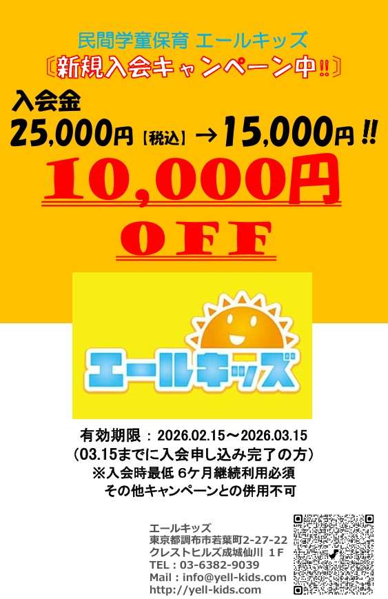 ただいま新規入会キャンペーンを実施中。3月15日(日)までに入会申し込みを完了した場合、入会金が割引されます。民間学童を検討中の方はもちろん、他の学童に通っている方も説明会に参加可能ですので興味のある方はぜひお気軽にお申し込みください。