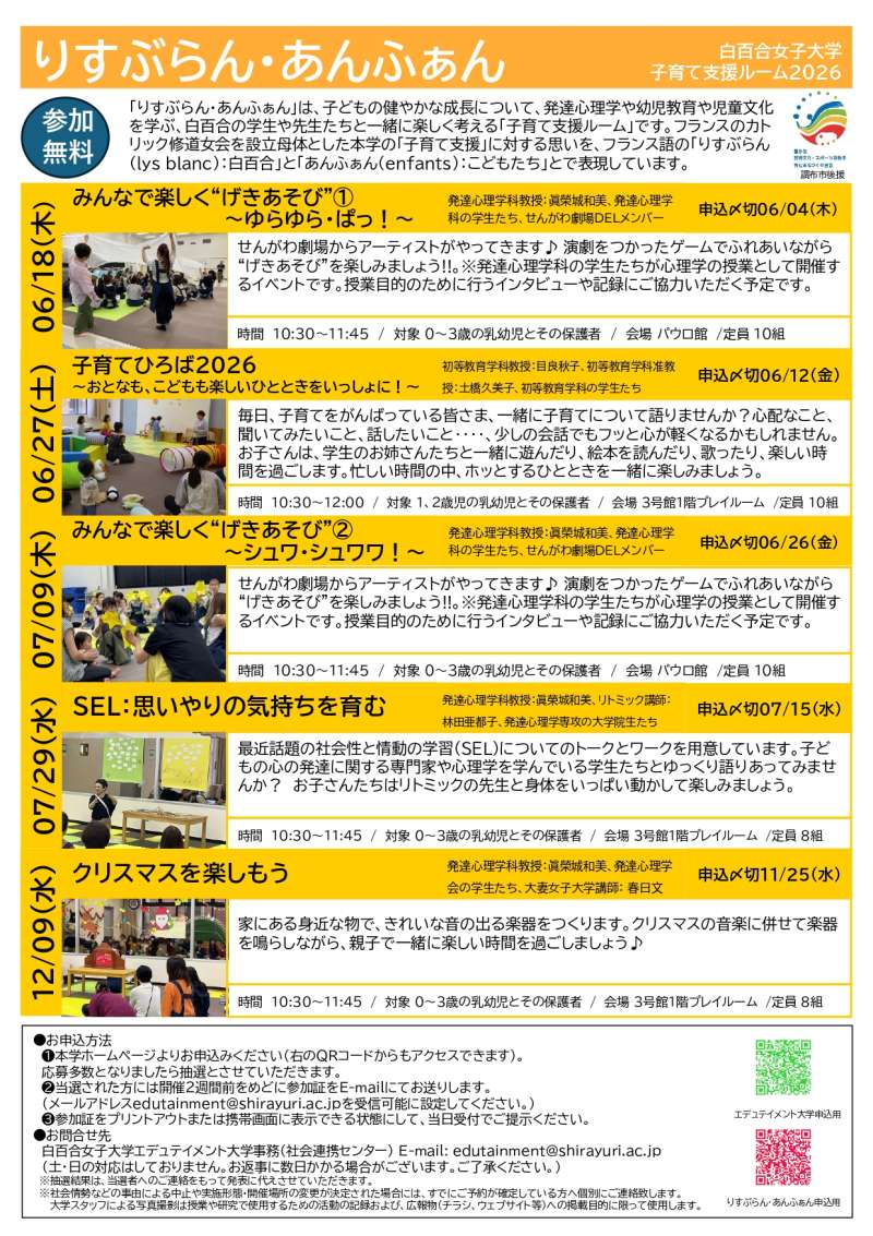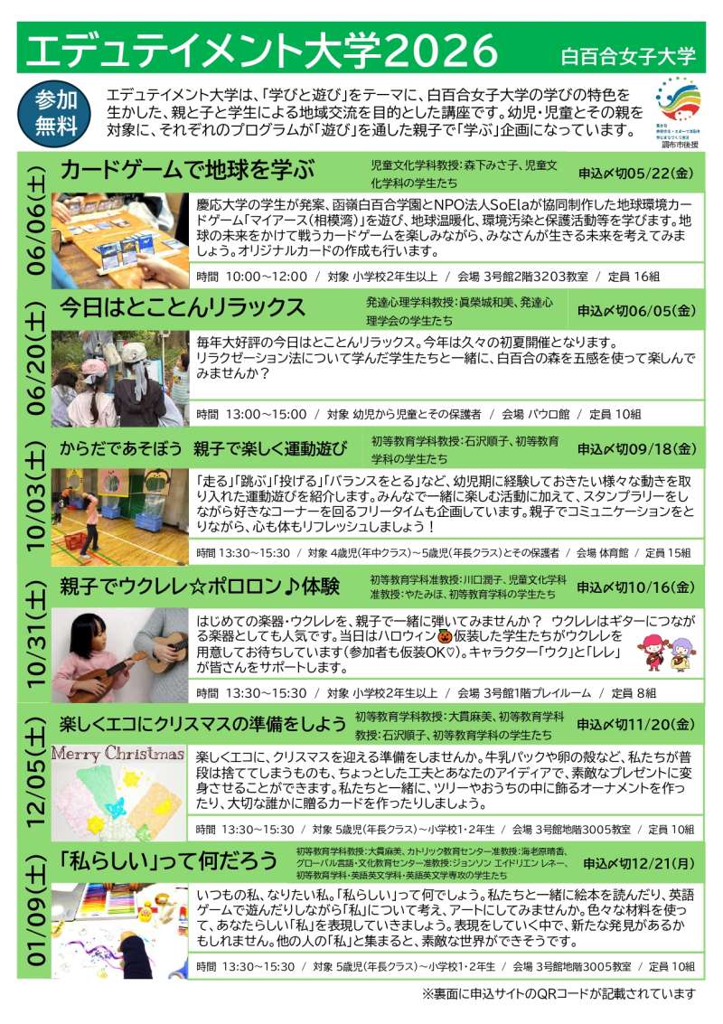 | プログラム | 乳幼児向けから小学生向けまで、年齢に合わせて選べる多彩なプログラムがそろっています。いずれも参加無料で、各回ごとに日程・申込締切が異なります。人気の回は抽選となるため、早めのチェックがおすすめです。 【りすぶらん・あんふぁん(乳幼児向け)】 ●みんなで楽しく“げきあそび”① ~ゆらゆら・ぱっ!~ 6/18(木)|申込締切:6/4(木) 演劇の要素を取り入れた遊びで、親子のふれあいと表現の楽しさを体験できます。 対象:0~3歳の親子 ●子育てひろば2026 6/27(土)|申込締切:6/12(金) 学生と一緒に遊んだりおしゃべりしたり、親子でほっとできるひととき。気軽にリフレッシュできます。 対象:1・2歳児の親子 ●みんなで楽しく“げきあそび”② ~シュワ・シュワワ!~ 7/9(木)|申込締切:6/26(金) 演劇の要素を取り入れた遊びで、親子のふれあいと表現の楽しさを体験できます。 対象:0~3歳の親子 ●SEL:思いやりの気持ちを育む 7/29(水)|申込締切:7/15(水) 子どもの心の成長について学びながら、親子で楽しく過ごす時間。子どもはリトミックで体を動かします。 対象:0~3歳の親子 ●クリスマスを楽しもう 12/9(水)|申込締切:11/25(水) 身近な素材で楽器づくりや音あそび。親子で季節を感じるクリスマスイベントです。 対象:0~3歳の親子 りすぶらん・あんふぁんの詳細やお申し込みについてはこちら(外部リンク)をご確認ください。 【エデュテイメント大学(幼児~小学生向け)】 ●カードゲームで地球を学ぶ 6/6(土)|申込締切:5/22(金) 環境をテーマにしたカードゲームで、楽しみながら地球の未来を考えます。オリジナルカード作りも。 対象:小学校2年生以上 ●今日はとことんリラックス 6/20(土)|申込締切:6/5(金) 五感を使って自然を楽しみながらリラックス。親子でゆったり過ごしたい方に。 対象:幼児~小学生の親子 ●からだであそぼう 親子で楽しく運動遊び 10/3(土)|申込締切:9/18(金) 走る・跳ぶ・投げるなどの動きを楽しく体験。スタンプラリーもあり、体を動かすのが好きな子にぴったり。 対象:年中~年長の親子 ●親子でウクレレ☆ポロロン♪体験 10/31(土)|申込締切:10/16(金) はじめてでも楽しめるウクレレ体験。ハロウィンに仮装した学生さんが迎えてくれます。参加者の仮装もOK! 対象:小学校2年生以上 ●エコで楽しむクリスマスづくり 12/5(土)|申込締切:11/20(金) 身近な素材を使ってオーナメントやカード作り。親子で楽しくエコ体験。 対象:年長~小学校1・2年生 ●「私らしい」って何だろう 1/9(土)|申込締切:12/21 絵本やゲーム、アートを通して「自分らしさ」を表現。新しい発見があるかも! 対象:年長~小学校1・2年生 エデュテイメント大学の詳細やお申し込みについてはこちら(外部リンク)をご確認ください。 |