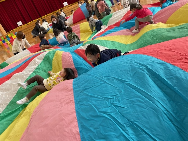 1歳ころから参加できる「マルガリタひろば」では、幼稚園のホールでリズム体操やマット、新聞紙あそびにバルーンあそびなどを、みんなで一緒に楽しみます。