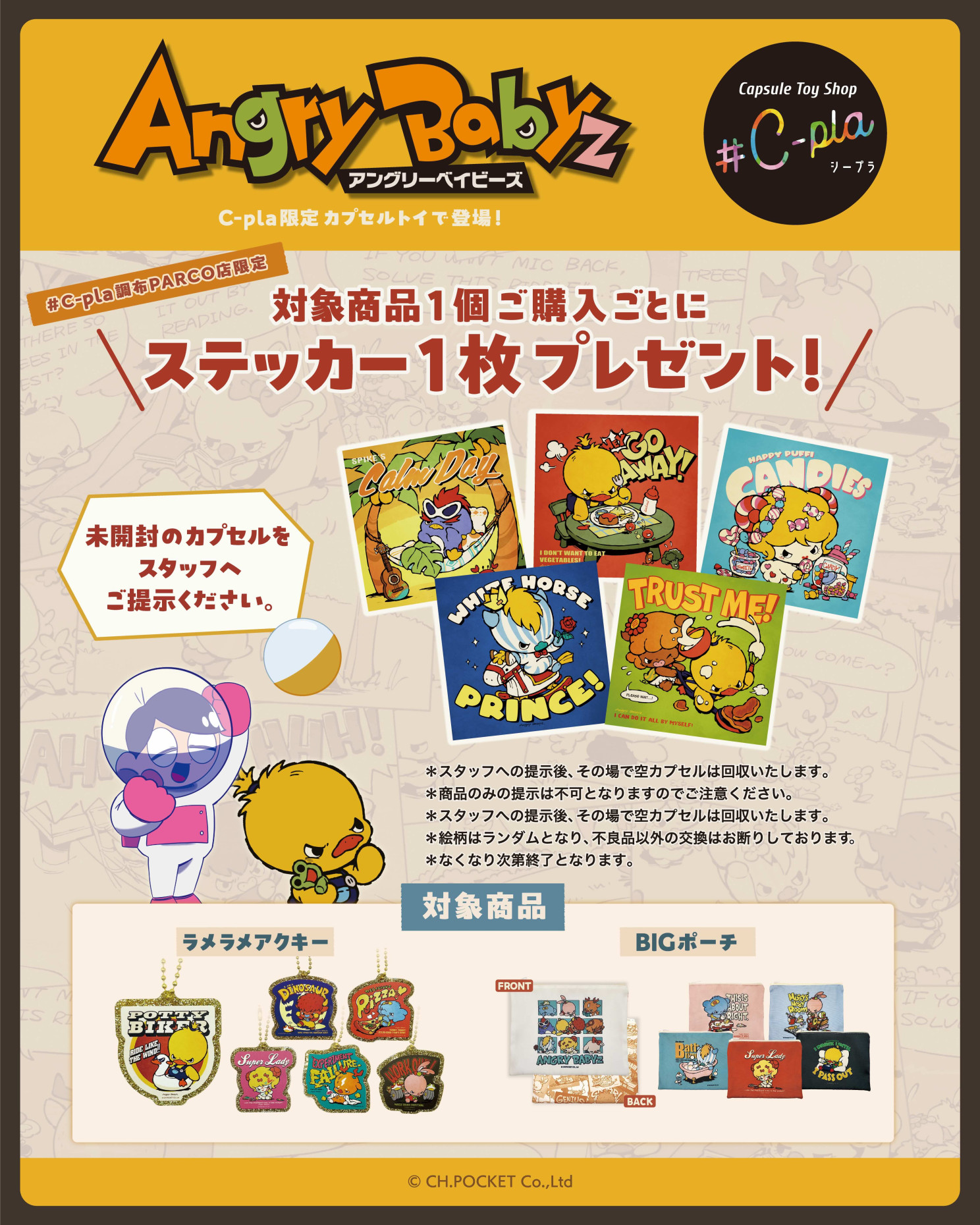 「AngryBabyz(アンベビ)」の生みの親、有限会社クリエイティブハウスポケットがある調布店では、初のカプセルトイ化を記念して特典のノベルティステッカー配布が決定。この機会にノベルティもGETできますので、ぜひおでかけください!