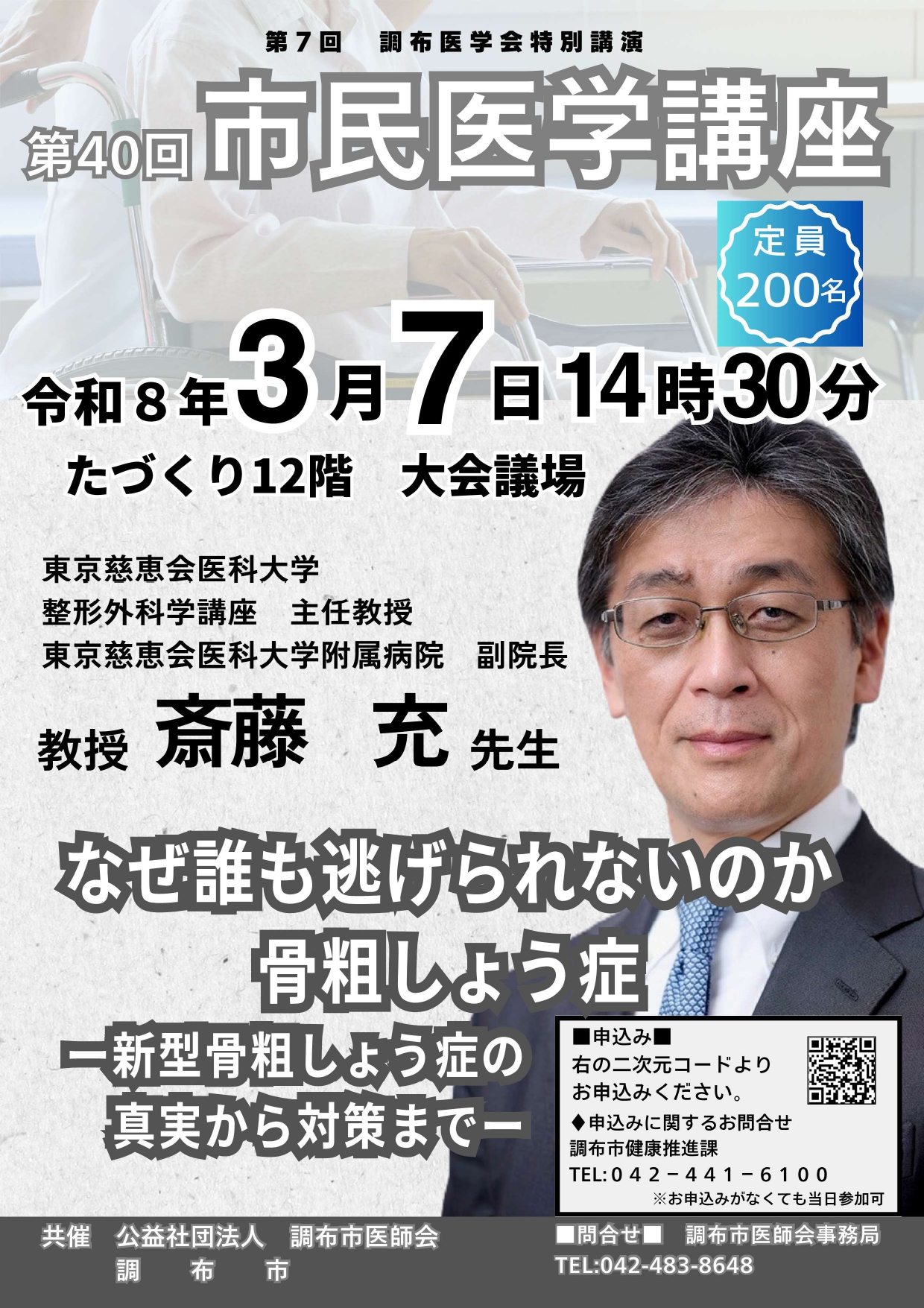 調布市医師会による「第40回 市民医学講座」が、2026年3月7日(土)に開催されます。今回のテーマは、「なぜ誰も逃げられないのか 骨粗しょう症―新型骨粗しょう症の真実から対策まで―」。年齢とともに身近になる骨の問題について、最新の知見と対策を学べる貴重な機会です。