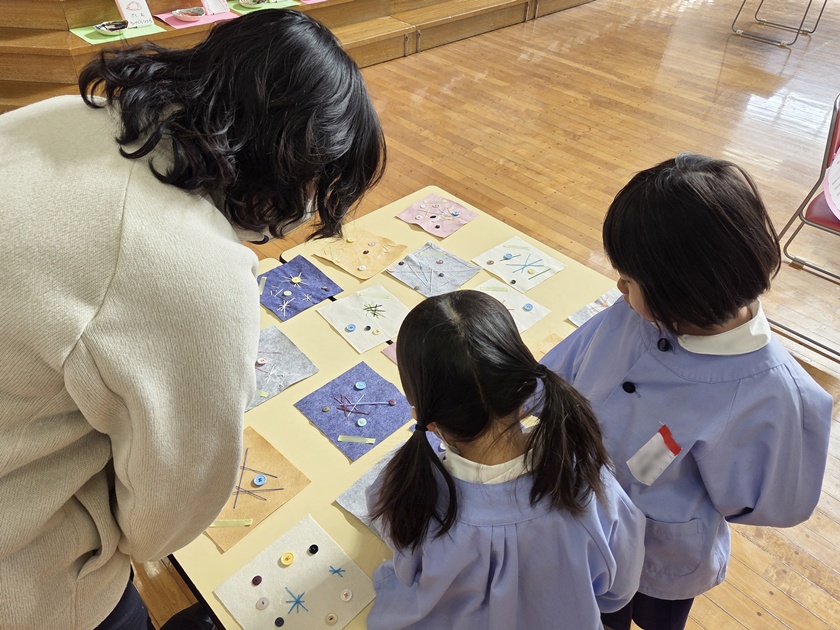 「てしごと」のコーナーでは、年長組の女の子たちが、園長の近江谷先生と話をしていました。年長組は今回、本物の針と糸を使って、「てしごと」に挑戦。フエルトに思い思いに模様を描き、ボタンも自分で縫い付けました。額にいれて飾りたくなるような素敵な作品を前に、保護者の方からも「こんなことができるようになるなんてすごい!」と声が上がりました。