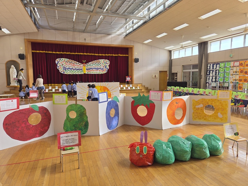 今年度の作品展のテーマは「はらぺこあおむし」。みんなが大好きな絵本の世界を、全園児で作り上げました。