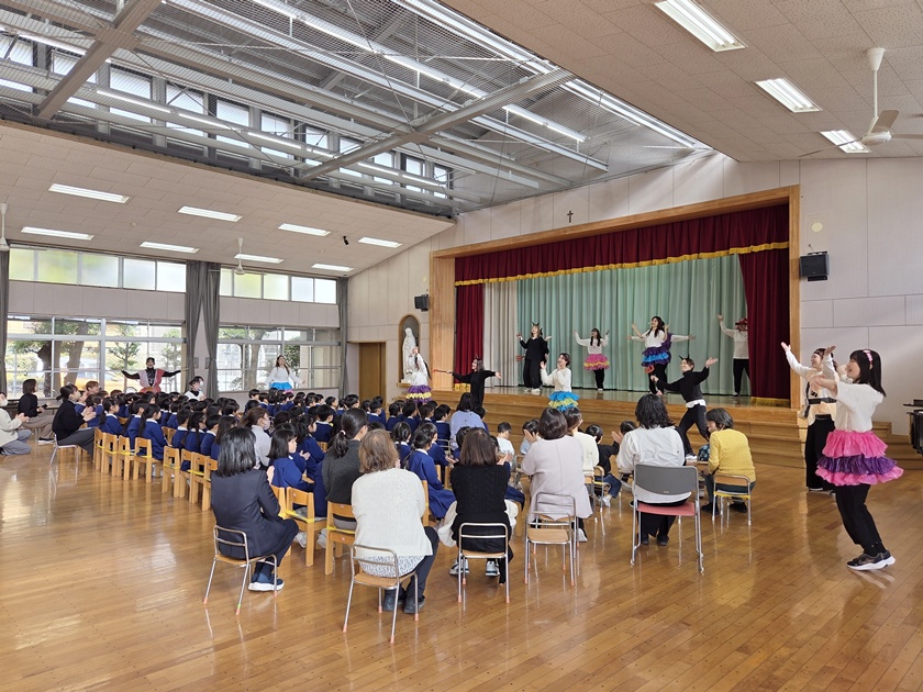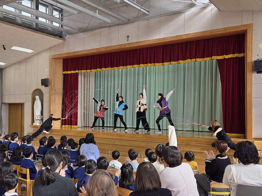 マルガリタ幼稚園では毎月、その月が誕生日の子どもたちをお祝いする誕生会が、園内のホールで開かれています。その中でも2月はちょっと特別に楽しみな月。なぜなら今月は、ダンスサークル「リズミック」のお母さんたちが、ダンスの発表をしてくれるからです。