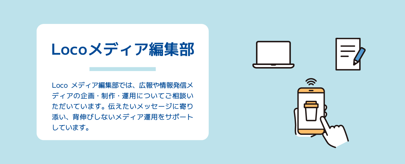 パートナーである依頼先の広報・情報発信に関する「困りごと」を解決するため、業務の一部を担っているLocoメディア編集部。Webサイト、SNS、広報誌等の企画・運用、ライティングなどの業務をニーズに合わせた形で代行することで、パートナーの成長をサポートしています。
