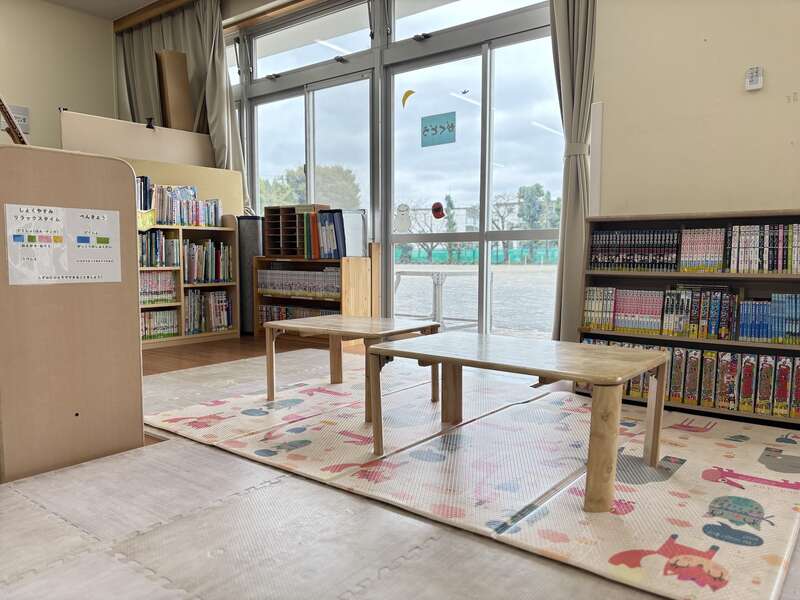 布田小学校の敷地内にある学童クラブ。窓が大きく開放的で明るい室内には読書ができるコーナーがあり、トイレ(写真3枚目)も清潔で快適な空間です。季節ごとのイベントが盛んで、たとえば真夏に開催した水鉄砲で水をかけあう「ウォーターフェスティバル」では子どもも大人(スタッフ)も夢中で遊ぶのだとか。