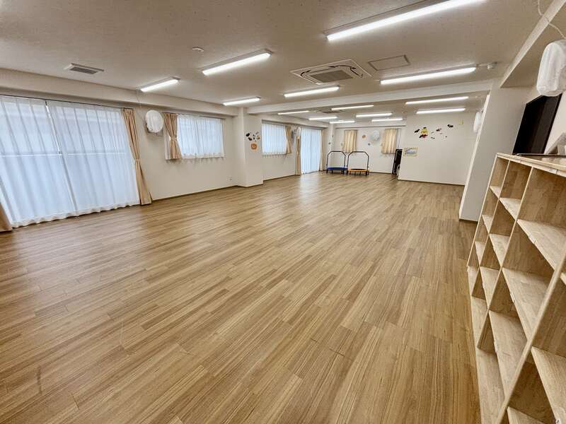 つつじケ丘駅から徒歩3分ほどのところにある学童クラブ。1階は読書や工作など静かに過ごす部屋、2階はドッジビーやトランポリンなど、主に体を動かす部屋として使っています(ほか和室2部屋)。滝坂小学校の校庭や体育館を利用することも。